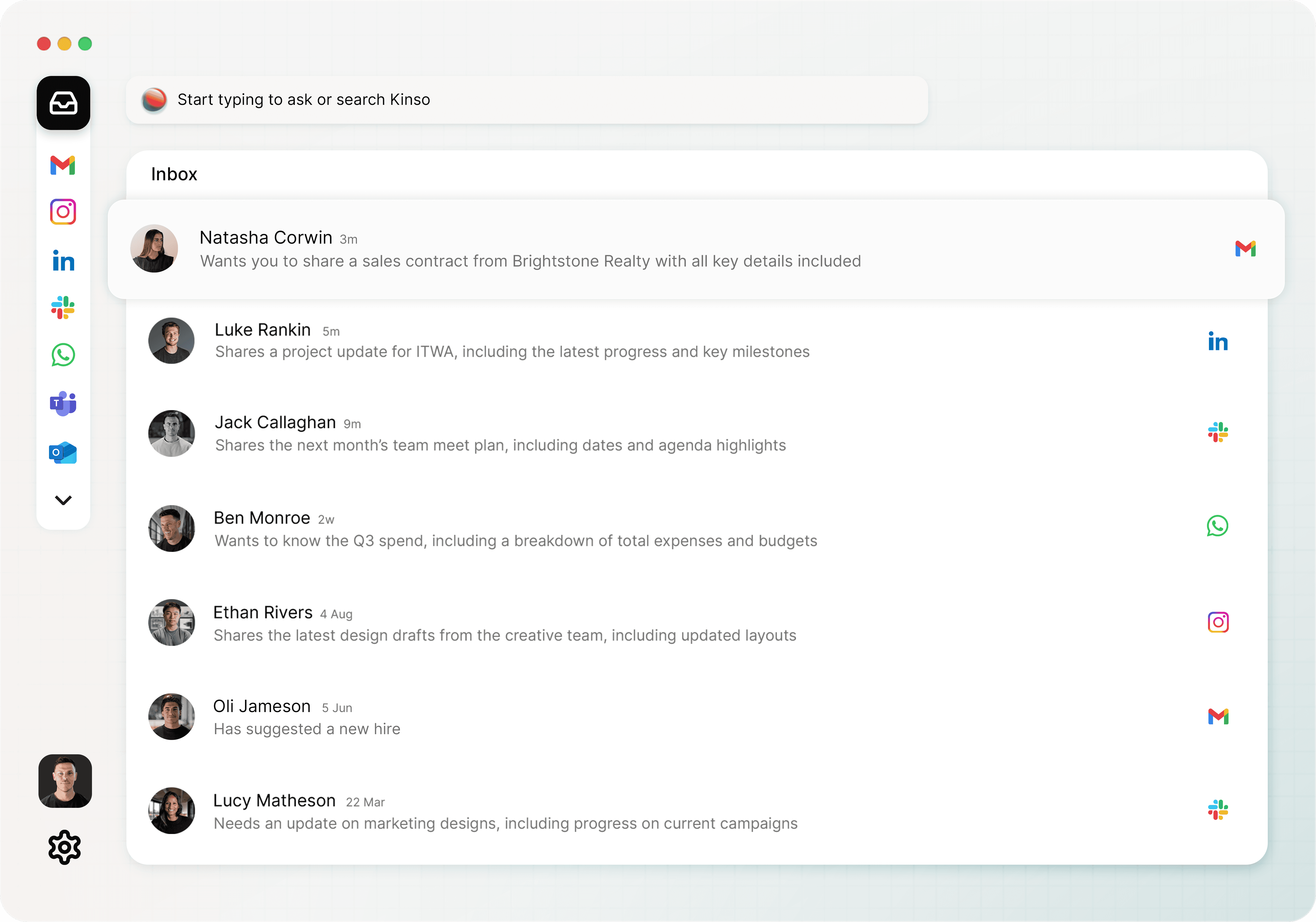 Kinso integrates with Gmail, LinkedIn, Slack, WhatsApp & Instagram. More integrations coming soon.