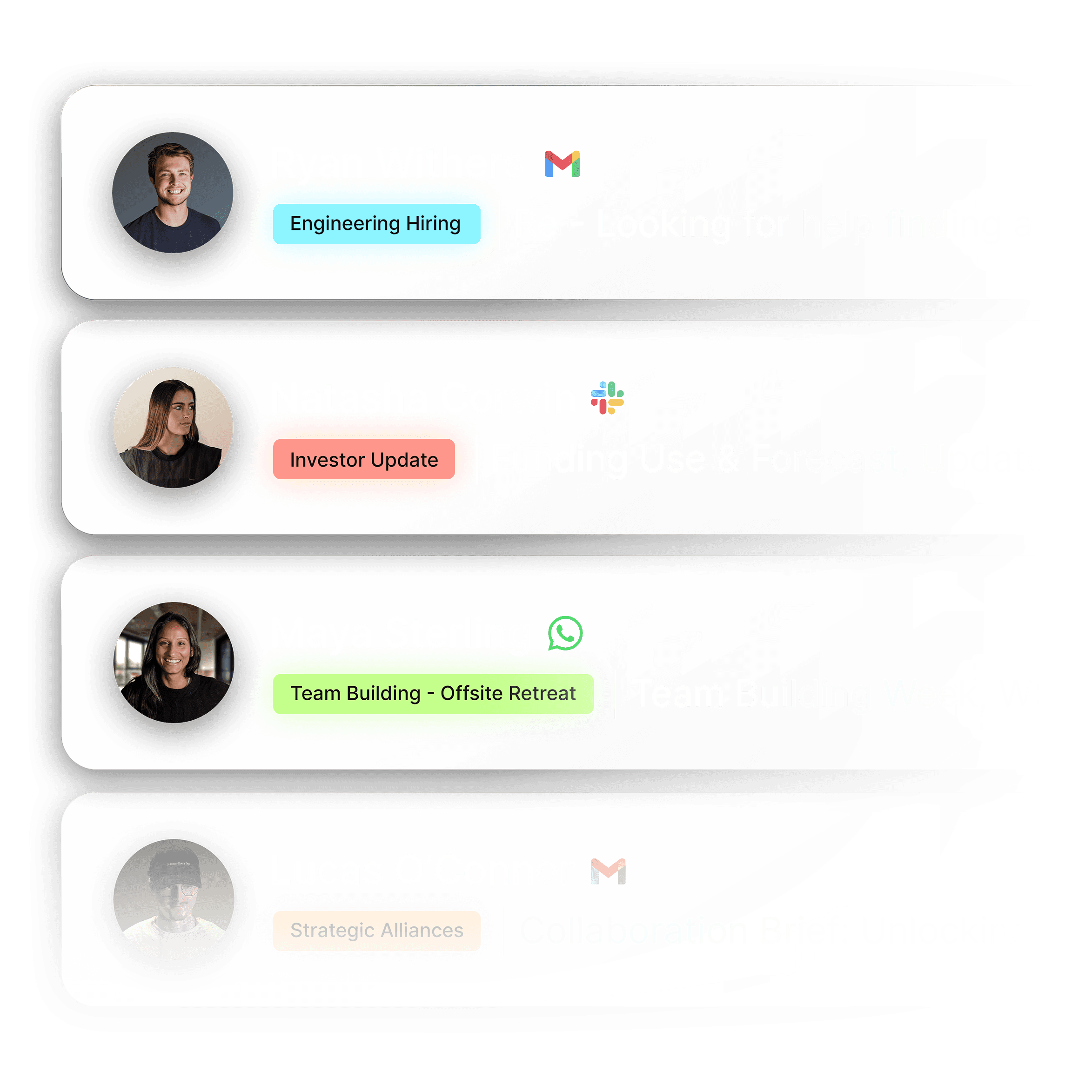 By learning the context of your conversations across different platforms, Kinso automatically labels every message with a relevant topic. No need to manually organise.