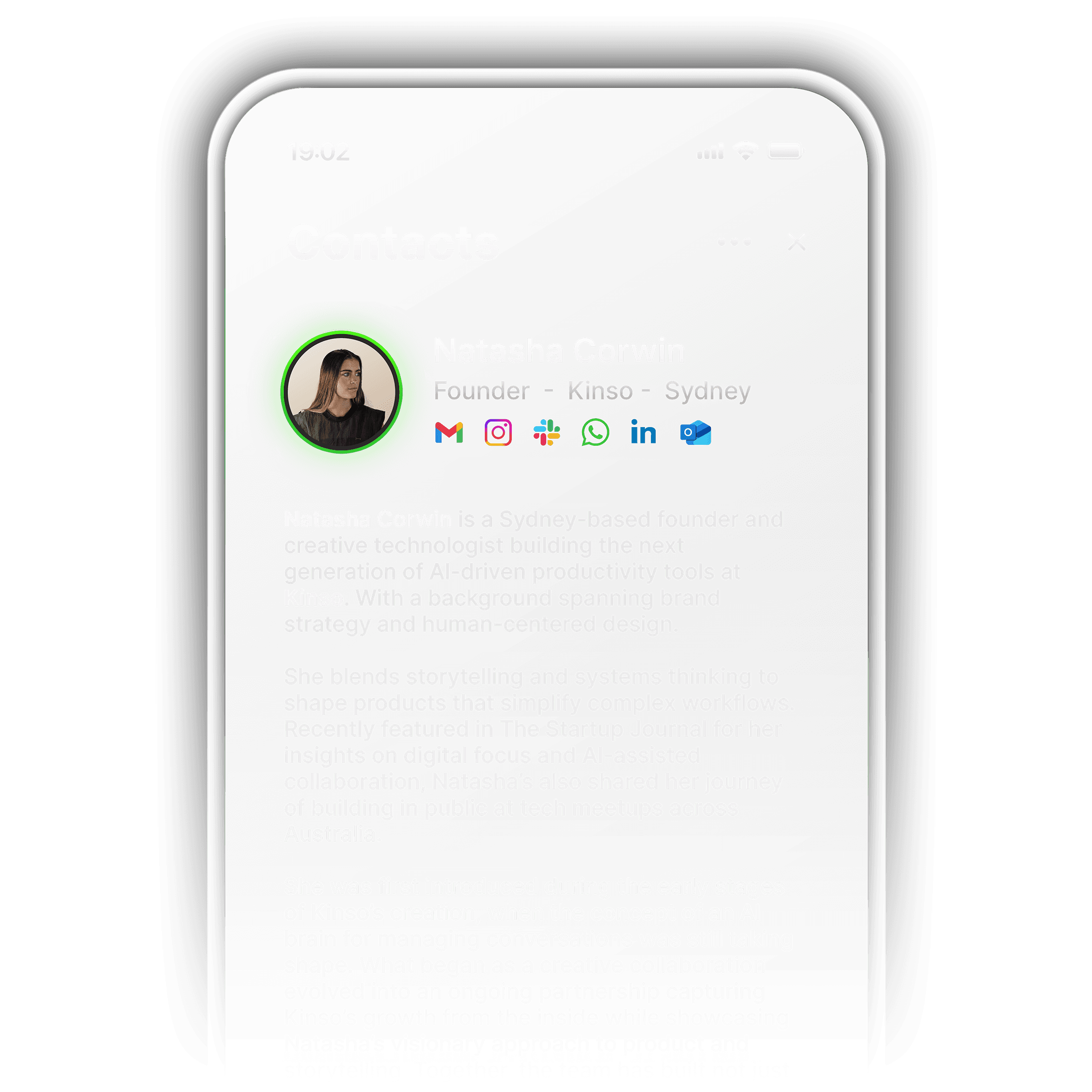 Your summarised history with a contact across every platform you’ve spoken on. Going into a meeting? Kinso will highlight the most important details you’ve discussed with them so you’re the most prepared version of yourself.